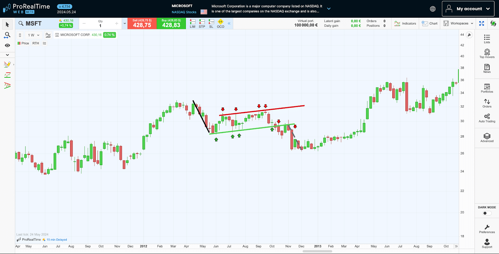 In this ProRealTime Web Platform Chart example, the NASDAQ COMPOSITE Index is captured forming an Ascending Triangle. It is confined by a rising bullish support level (in green) and a steadfast horizontal resistance (in red). Upon breaking out from the top of the triangle, the Index typically exhibits a bullish thrust.