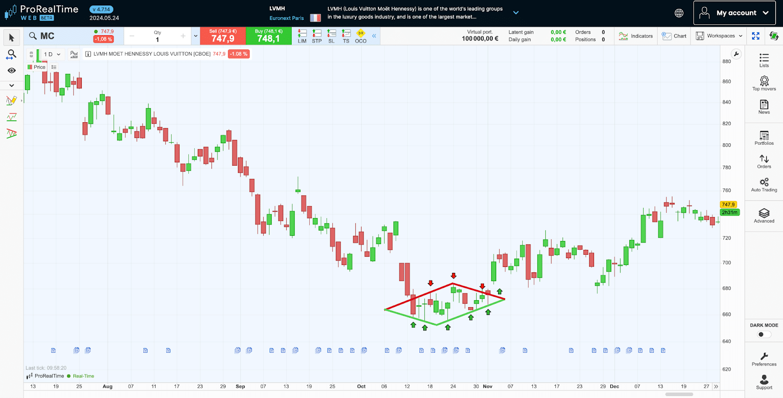 This chart pattern reflects a uncertain phase in the market during which volatility increases with new lows, then decreases with lower lows. Once the stock exits the diamond from the top, prices increase.