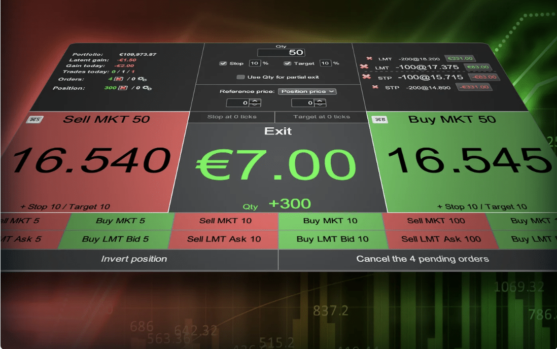 The order panel at the top of your chart allows you to select the quantity to buy or sell, the direction of your trade (buying or selling), and the type of market order to place (market order, limit order, stop order, etc.).