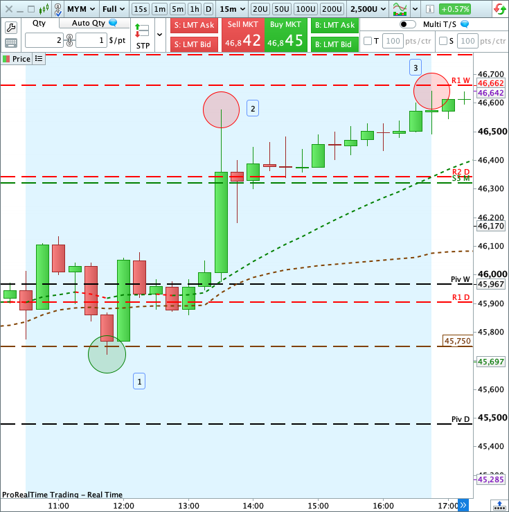 The early selling pressure managed to hit the symbolic 45,750-point level [1] before the market continued its rebound following the Iranian president’s statements. However, the buying push toward weekly resistance 1 failed twice [2][3].