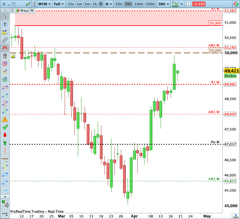 In this context, I’ll favor bullish trades again with a target of the symbolic 50,000-point threshold (where a correction could develop).