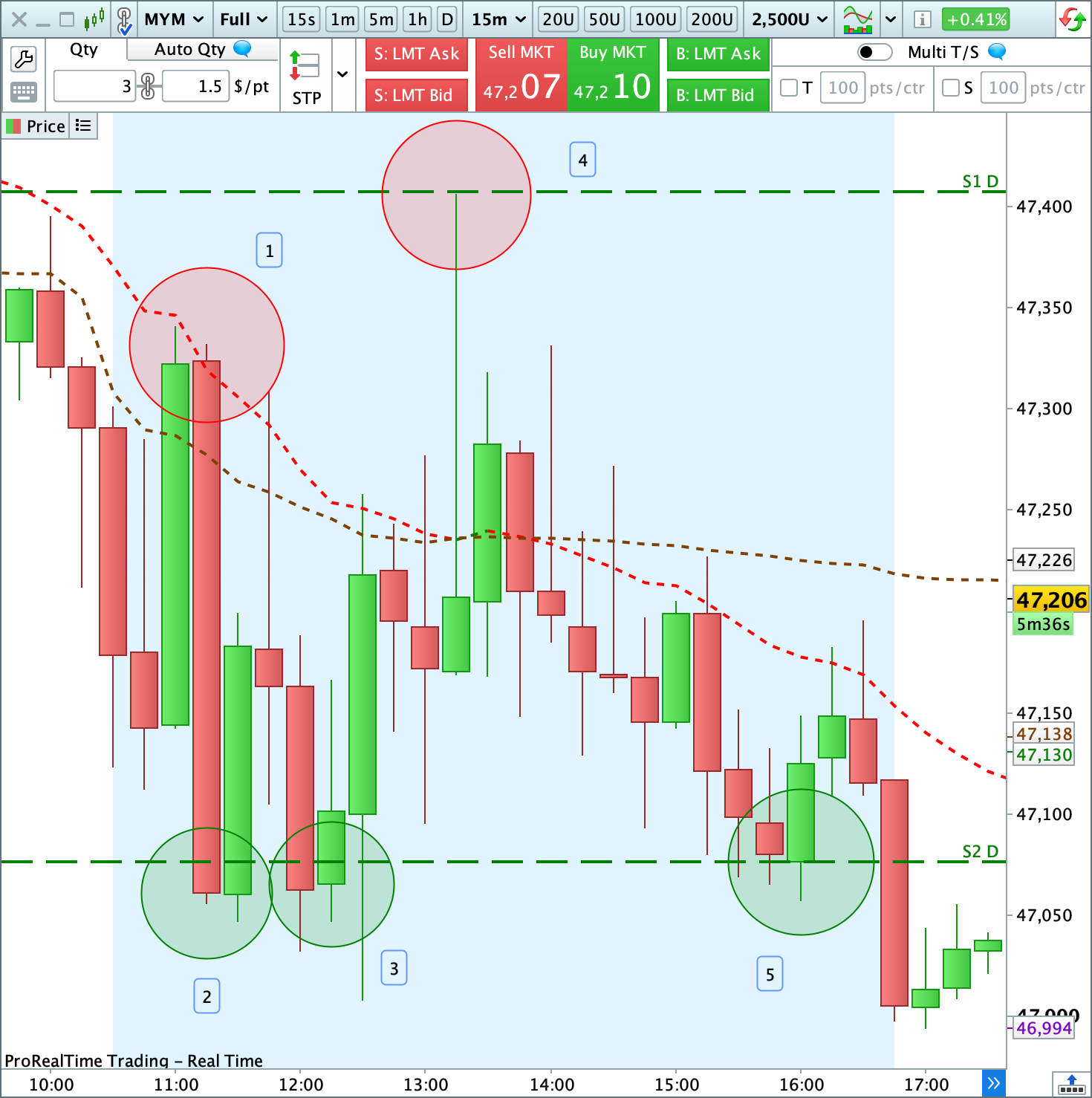 Buyer-led pushes toward daily Support 1 [1][4] never made it to their target. Short seller attacks toward daily Support 2, on the other hand, hit the mark every single time [2][3][5].