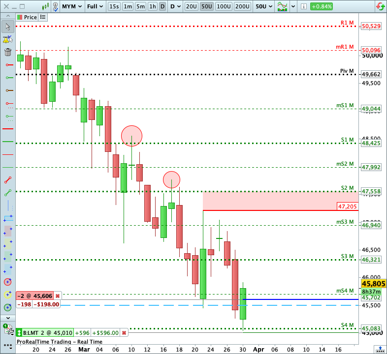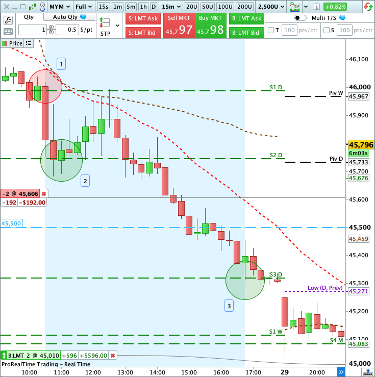 The sellers’ first offensive brought the market straight down to daily support 2 [2]. The second wave then pushed Dow futures to daily support 3 [3], marking a new annual low.